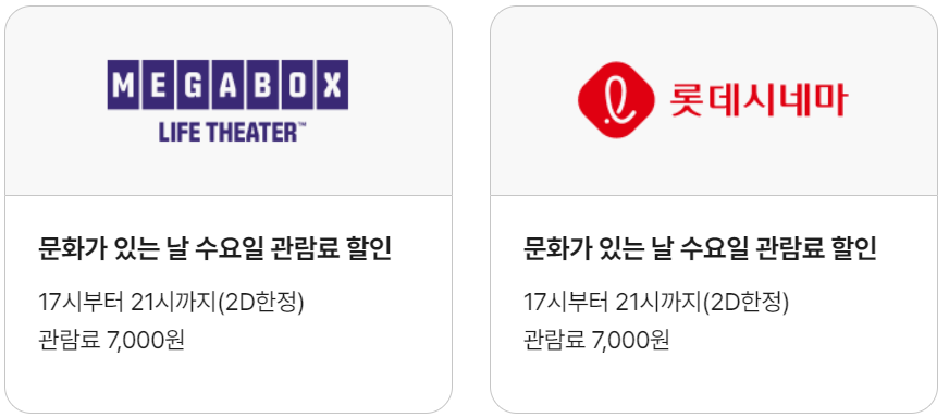 매달 마지막 주 수요일에는 영화 할인이 되는데요 요즘 영화 티켓값이 부담되는데요 이날 만큼은 1인당 7,000원으로 저렴하게 관람이 가능합니다. 매번 모르게 놓치고 있었던 "문화가 있는 날"이었는데요 10월에는 두 번이나 가능하니 꼭 즐기시기 바랍니다. 10월22일 수요일과 29일 수요일 모두 혜택을 받을 수 있습니다.