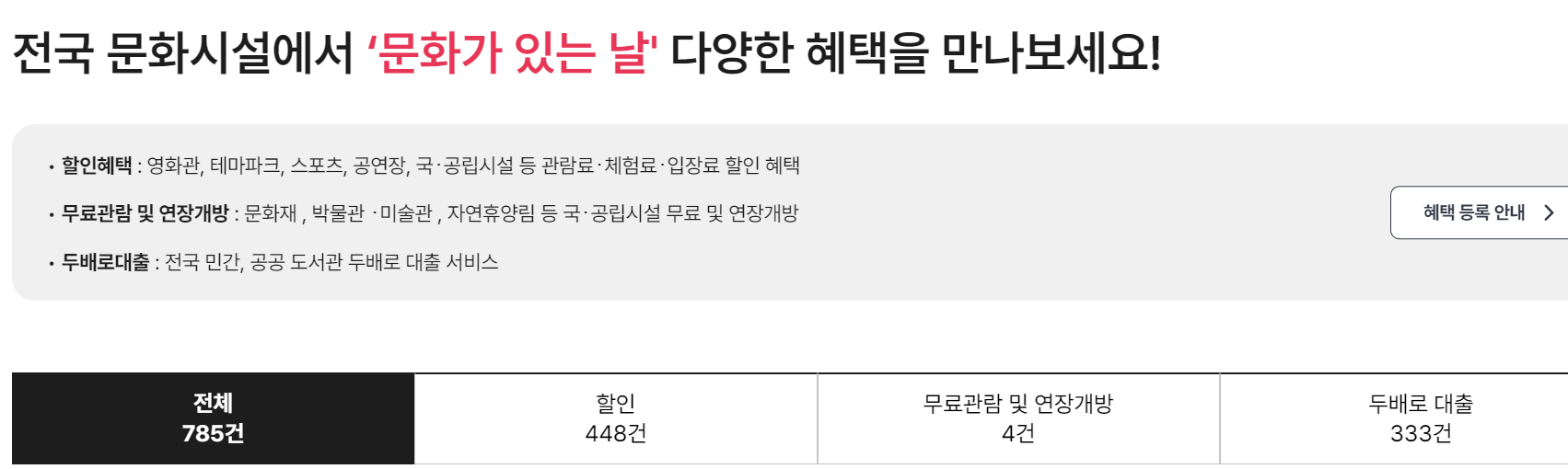 이렇게 문화가 있는 날엔 전체 785건이나 되는 혜택이 있으니 자신의 취향을 찾아 골라서 즐기는 것을 추천합니다.